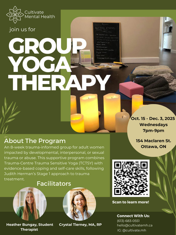 An 8-week trauma-informed group for adult women impacted by developmental, interpersonal, or sexual trauma or abuse. This supportive program combines Trauma-Centre Trauma Sensitive Yoga (TCTSY) with evidence-based coping and self-care skills, following Judith Herman’s Stage 1 approach to trauma treatment. Together, we focus on building safety, stability, and connection in a compassionate, non-judgmental space.